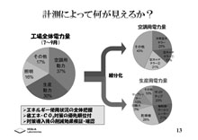 これを細かくご説明すると時間がなくなってしまうのですが、ざっと何が見えてきたかということの一番大本を申し上げますと、工場全体の3ヵ月の電力量の中で、実は測ってみると、特に夏だったということもあると思いますが、生産動力よりも空調のほうが多かった。このように消費別に見えてきています。さらにそれを細分化して、空調動力の37%は、いったいどういう機器がどれだけ使っているかというところをきちっと把握しております。生産動力については、どういう機器がどういうふうに使っているか。意外と乾燥機が多いんだなということがよくわかってきます。