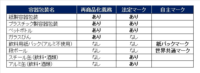 容器包装に付される識別表示マークには資源有効利用促進法に定める法定マークと業界団体が定める自主マークがある。また、容リ法に定める事業者の再商品化義務と資源有効利用促進法に定める識別表示マークとは必ずしも連動していないので注意を要する。