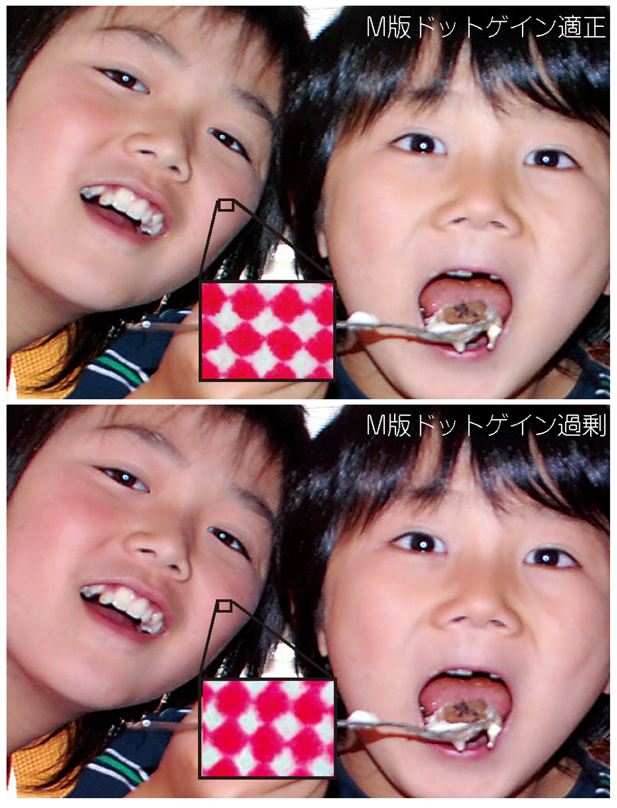 輪転印刷はシート印刷と比べると大きい。良い印刷再現を得るためには,ドットゲインをできるだけ小さくすることと,印刷版を,あらかじめドットゲイン量を見積もって網点を小さく再現させておくことが大切である。