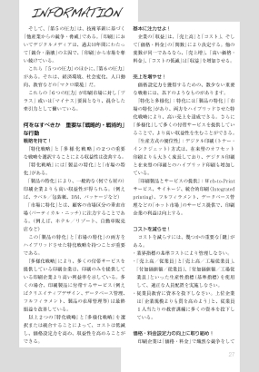 27そして、『第5の圧力』は、技術革新に基づく「他産業からの競争・脅威」である。「印刷」においてデジタルメディアは、過去10年間にわたって「競合・崩壊」の主因で、「印刷」から市場を奪い続けている。これら『5つの圧力』のほかに、『第6の圧力』がある。それは、経済環境、社会変化、人口動向、教育などの「マクロ環境」だ。これらの『6つの圧力』が印刷市場に対し「プラス」或いは「マイナス」要因となり、混合した牽引力として働いている。何をなすべきか重要な「戦略的・戦術的」な行動戦略を持て!『特化戦略』と『多様化戦略』の2つの重要な戦略を選択することによる収益性は改善する。『特化戦略』には「製品の特化」と「市場の特化」がある。「製品の特化」により、一般的な(何でも屋の)印刷企業よりも高い収益性が得られる。(例えば、ラベル/包装紙、DM、パッケージなど)「市場に特化」とは、顧客の市場区分の垂直市場(バーティカル・ニッチ)に注力することである。(例えば、ホテル/リゾート、自動車販売店など)この「製品の特化」と「市場の特化」の両方をハイブリッドさせた特化戦略を持つことが重要である。『多様化戦略』により、多くの付帯サービスを提供している印刷企業は、印刷のみを提供している印刷企業より高い利益率を示している。多くの場合、印刷製品に付帯するサービス(例えばクリエイティブデザイン、データベース管理、フルフィラメント、製品の在庫管理等)は最終損益を改善している。以上2つの『特化戦略』と『多様化戦略』を選択または統合することによって、コストは低減し、価格設定力を高め、収益性を高めることができる。基本に注力せよ!企業の「収益」は、「売上高」と「コスト」、そして「価格・料金」の「関数」により決定する。他の変数が同一であるなら、「売上増」、「高い価格・料金」、「コストの低減」は「収益」を増加させる。売上を増やせ!価格設定力を獲得するための、数少ない重要な戦術には、以下のようなものがあります。『特化と多様化』:特化には「製品の特化」「市場の特化」があり、両方をハイブリッドさせた特化戦略により、高い売上を達成できる。さらに「多様化」して多くの付帯サービスを提供していることで、より高い収益性を生むことができる。『生産方式の優位性』:デジタル印刷(トナー・インクジェット)方式は、在来型のオフセット印刷よりも大きく成長しており、デジタル印刷と在来型の印刷とのハイブリッド印刷も増加している。『印刷製品とサービスの提供』:Web-to-Printサービス、サイネージ、統合的印刷(Integratedprinting)、フルフィラメント、データベース管理などの「ホット市場」のサービス提供で、印刷企業の利益は向上する。コストを減らせ!コストを減らすには、幾つかの重要な「鍵」がある。・業界指標の基準コストにより管理しなさい。・「売上高/従業員」と「売上高/工場従業員」、「付加価値額/従業員」、「付加価値額/工場従業員」といった生産性指標(基準指標)を使用して、適正な人員配置を実施しなさい。・従業員教育に資本を投下しなさい。上位企業は「企業規模よりも質を高めよう」と、従業員1人当たりの教育訓練に多くの資本を投下している。価格・料金設定力の向上に取り組め!印刷企業は「価格・料金」で熾烈な競争をして